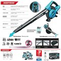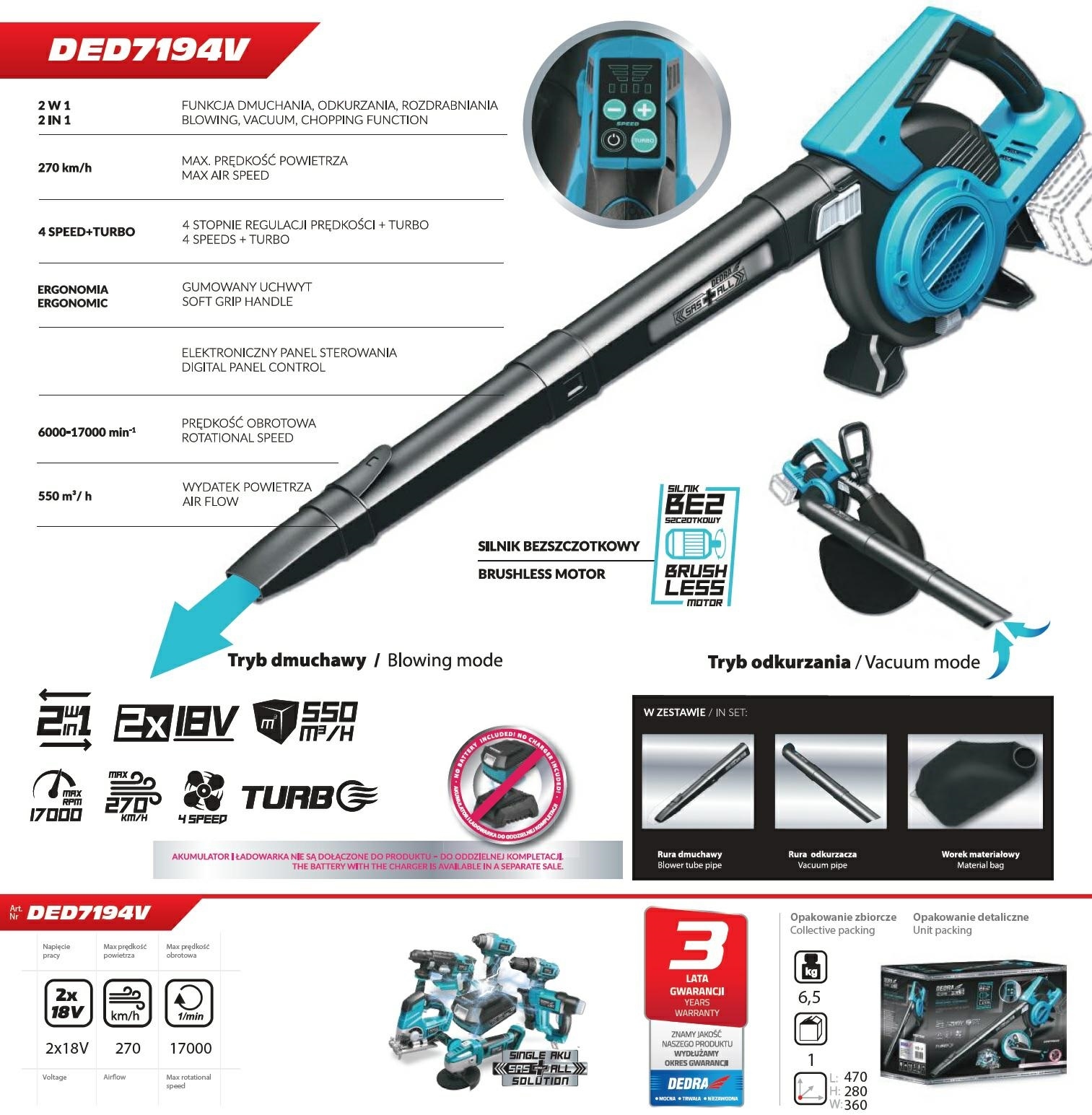 Dane techniczne dmuchawy do liści akumulatorowej 18V, DEDRA SAS+ALL DED7093:Napięcie: 18VPrędkość wydmuchiwanego powietrza: 144 km/hPrzepływ powietrza: 570m3Prędkość obrotowa: 16000 RPMWaga: 1,8 KgPrzybliżone czasy pracy dla akumulatorów: 2Ah - DED7032: tryb standard - 12 min/tryb turbo - 7 min (czyszczenie kostki brukowej) 4Ah - DED7034: tryb standard - 22 min/tryb turbo - 13 min (czyszczenie kostki brukowej) 5Ah - DED7035: tryb standard - 25 min/tryb turbo - 14 min (czyszczenie kostki brukowej) Produkt nie zawiera akumulatora oraz ładowarki