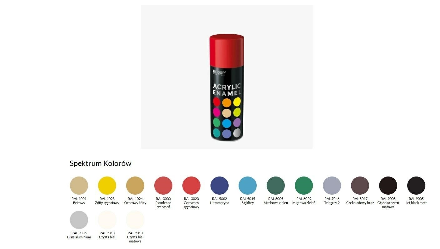 Uniwersalna, szybkoschnąca emalia akrylowa. Tworzy trwałą, błyszczącą powłokę odporną na uderzenia mechaniczne i warunki atmosferyczne. Ma stabilny odcień, nie blaknie na słońcu i nie traci połysku. Wysoka odporność na promieniowanie UV i trwałość. Odporna na zmiany temperatury. Kolory odpowiadają europejskiemu klasyfikatorowi RAL.Doskonała przyczepność na wielu materiałachGładka powierzchniaSuper połyskSzybkoschnącaOchrona przed korozjąOdporna na warunki atmosferyczneOdporna na promieniowanie UVDo użytku zewnętrznego i wewnętrznego