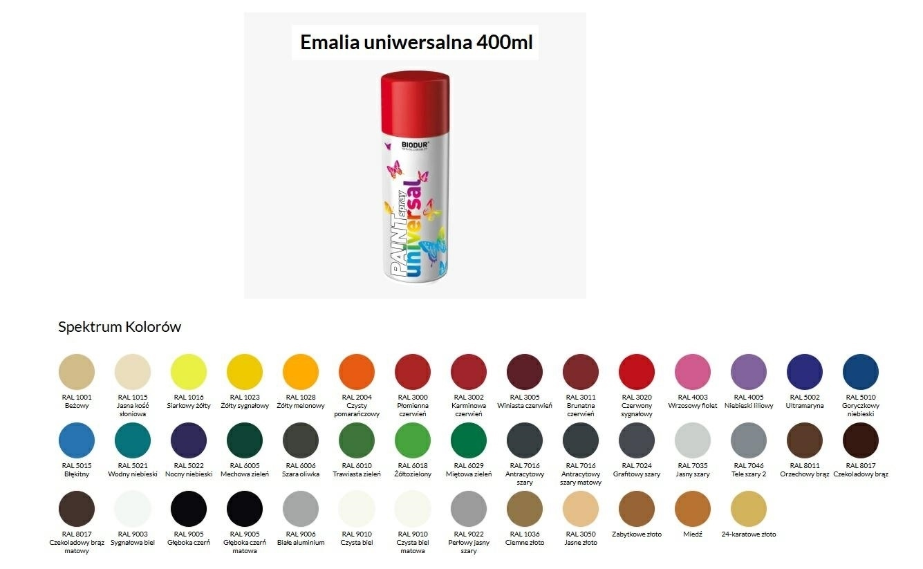 Emalia uniwersalna 400mlSzybkoschnąca farba alkidowa wzmocniona akrylatami (we wszystkich standardowych kolorach RAL) do wielu powierzchni. Tworzy trwałą, błyszczącą powłokę odporną na działanie mechaniczne i warunki atmosferyczne. Nie blaknie pod wpływem promieni słonecznych i pozostaje błyszcząca.Bardzo dobra przyczepność na wielu materiałachGładka powierzchniaSzybkoschnącaOdporna na warunki atmosferyczneOdporna na promieniowanie UVDo użytku zewnętrznego i wewnętrznego