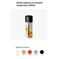 Emalia odporna na wysokie temperatury 400mlWysokiej jakości elastyczna farba na bazie żywic silikonowych. Krótkoterminowa i długoterminowa temperatura grzania zależy od koloru emalii. Farba zawiera składniki antykorozyjne, które chronią powierzchnię przed rdzą.Doskonała przyczepnośćOdporność na temperatury do 400°C:czarna i srebrna: krótkoterminowa temperatura grzania (do 4 godzin) +600°C, długoterminowa temperatura grzania +400°Cinne kolory: krótkoterminowa temperatura grzania +400°C, długoterminowa +200°COchrona przed rdząBardzo dobre właściwości wypełniająceDoskonałe pokrycieOdporna na warunki atmosferyczneDo użytku zewnętrznego i wewnętrznego