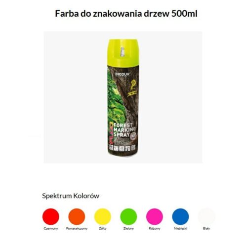 Biodur FOREST MARKING SPRAY, aerozolFarba do znakowania drzew 500mlSpecjalna farba fluorescencyjna do znakowania lasu, napisów, numeracji drzew, ziemi, kamieni i gleb mineralnych.Farba może być używana pod każdym kątemZakres temperatur stosowania: -10°C do 45°CWysoka widoczność nawet z daleka dzięki swojej wysoce fluorescencyjnej formuleTrwałość oznakowania: 12-24 miesiące w zależności od powierzchni, warunków aplikacji i ekspozycji na UVSpecjalna dysza idealna do płaskiego rozpylaniaOdporna na warunki atmosferyczneSzybkoschnąca: około 7-10 minutOdporna na promieniowanie UVDoskonała przyczepność do wielu powierzchniMożliwość 100% opróżnienia puszki przez rozpylanieBez zacieków