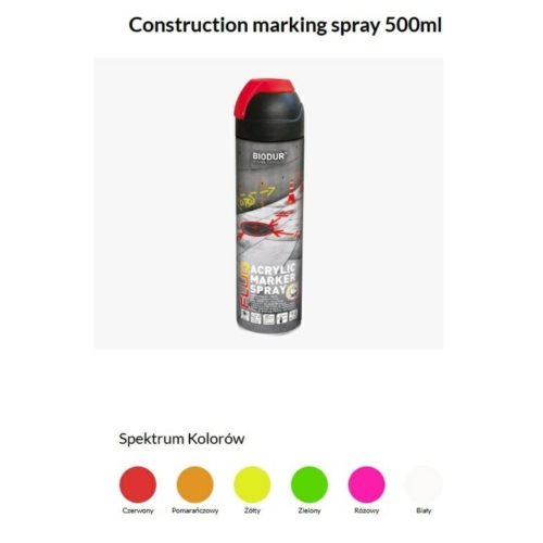 Construction marking spray 500mlSpecjalna farba fluorescencyjna o wysokiej jasności do profesjonalnego oznakowania na placach budowy obiektów mieszkalnych i przemysłowych.Farba może być używana pod każdym kątemZakres temperatur stosowania: -10°C do 45°CWysoka widoczność nawet z daleka dzięki swojej wysoce fluorescencyjnej formuleOdporna na warunki atmosferyczneErgonomiczna pokrywa umożliwia używanie rękawicFarba zawiera jasny pigment fluorescencyjny i pozostaje widoczna przez 6-12 miesięcy w zależności od powierzchni, warunków aplikacji i ekspozycji na UVPozwala narysować wyraźną linię o całkowitej długości 300 metrówSzybkoschnąca: około 7-10 minutOdporna na promieniowanie UVDoskonała przyczepność do wielu powierzchniMożliwość 100% opróżnienia puszki przez rozpylanie
