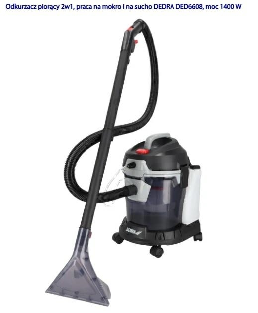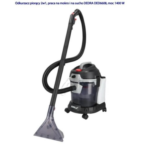 Urządzenie posiada dwa tryby pracy: w pierwszym odkurzacz przeznaczony jest do czyszczenia na mokro i na sucho twardych powierzchni takich jak podłogi, w drugim funkcja odkurzacza piorącego umożliwia czyszczenie dywanów czy tapicerek na mokro i na sucho. To sprawia, iż odkurzacz jest wielofunkcyjny i nadaje się do wielu zadań.Zdalny system natryskowy i próżniowyDwa duże tylne koła, dwa z uniwersalnymi mocnymi kołami skrętnymiDotykowy wyłącznik bezpieczeństwaDwie funkcje:Tryb 1: do czyszczenia na mokro i na sucho, do twardej podłogiTryb 2: jako odkurzacz piorący do dywanów, do czyszczenia dywanów na mokro i na suchoPojemny, wytrzymały zbiornik z tworzywa sztucznegoLiczne akcesoria w zestawieDane techniczne odkurzacza piorącego 2w1 DEDRA DED6605:Moc: 1200WNapięcie: 220-240VCzęstotliwość: 50/60HzSiła ssania: 17kPaPojemność zbiornika: 20lMateriał zbiornika: tworzywo sztuczneDługość węża: 1,5mPoziom hałasu: 76dbARodzaj filtra: filtr nabojowy