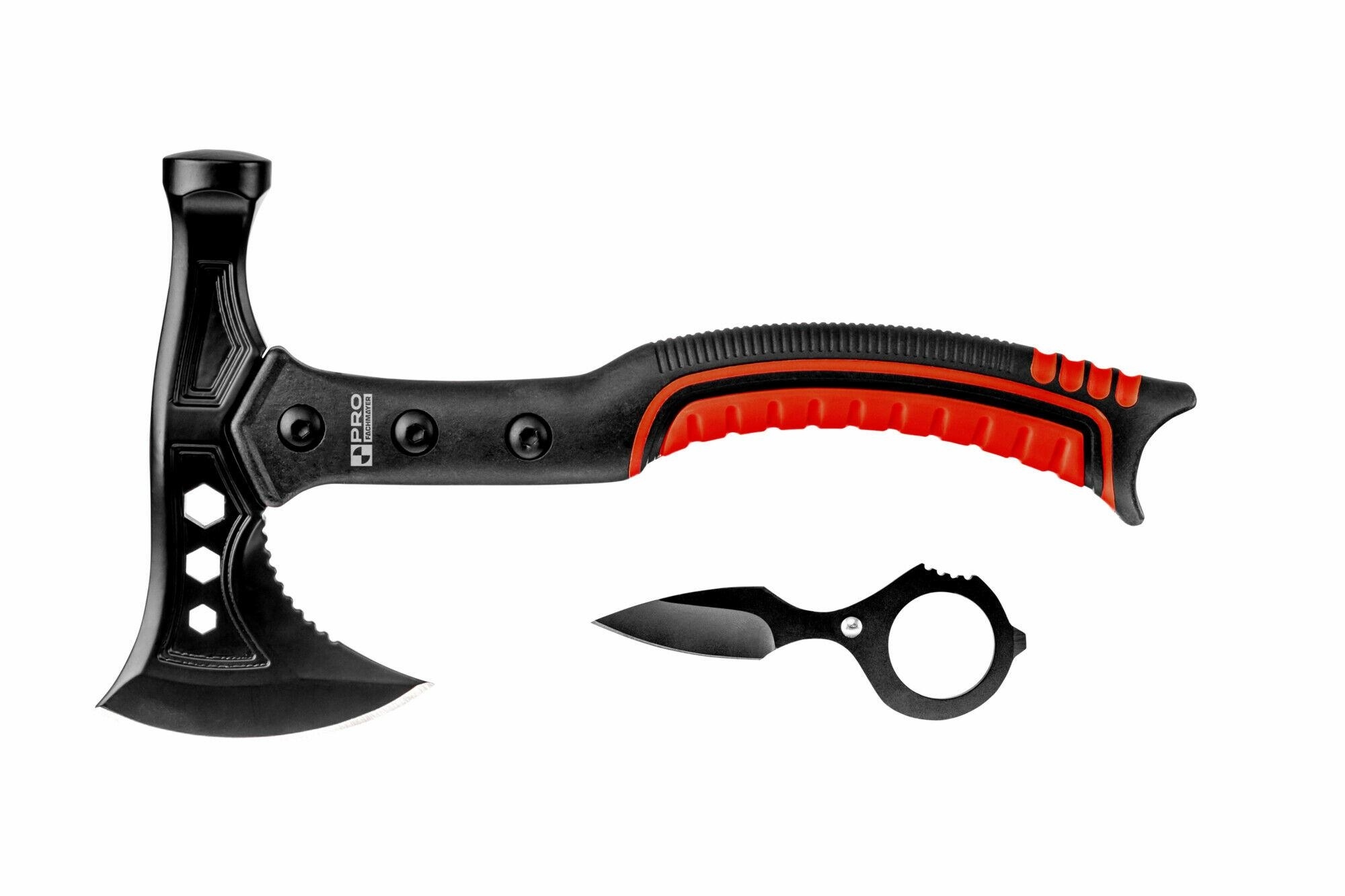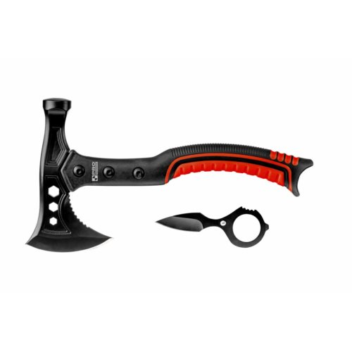 wielofunkcyjna siekiera z nożemostrze siekiery ze stali nierdzewnej 3Cr13 cechujące się wysoką twardością i odpornością na zużycieręcznie młotkowana powierzchnia z powłoką antykorozyjnąunikalna, solidna i trwała konstrukcjagłowica wyposażona w trzy otwory umożliwiające odkręcanie śrub HEX w rozmiarach 7, 9 i 11 mmczęść robocza wyposażona dodatkowo w funkcję młotka wyprofilowana rękojeść wykonana z gumy termoplastycznej TPR wzmocniona włóknem nylonowym zapewniająca pewny chwyt