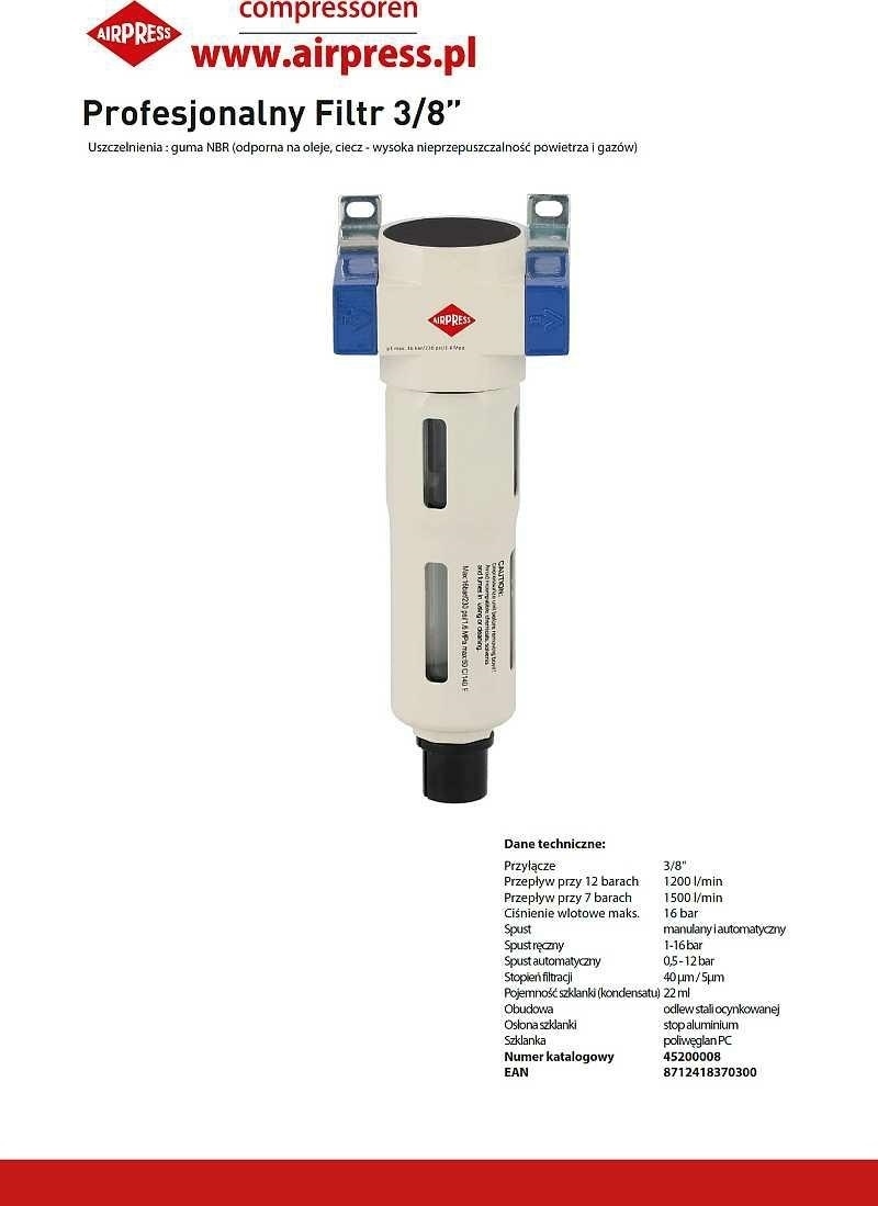 przyłącze 3/8"przepływ przy 12 barach - 1200l/minprzepływ przy 7 barach - 1500l/minciśnienie wlotowe max: 16 barspust : manulany i automatycznyspust ręczny : 1-16 barspust automatyczny 0,5-12 barstopień iltracji 40µm / 5µmpojemność szklanki (kondensatu) 22mlobudowa: odlew stali ocynkowanejosłona szklanki: stop aluminiumszklanka : poliwęglan PCuszczelnienia : guma NBR (odporna na oleje, ciecz - wysoka nieprzepuszczalność powietrza i gazów)
