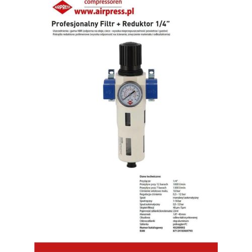 Filtr powietrza z reduktorem 1/4 15 BARkod: 45200002kod ean:8712418369793przyłącze 1/4"przepływ przy 12 barach - 1000l/minprzepływ przy 7 barach - 1300l/minciśnienie wlotowe max: 16 barregulacja ciśnienia: 0,5 - 12 barspust : manulany i automatycznyspust ręczny : 1-16 barspust automatyczny 0,5-12 barstopień iltracji 40µm / 5µmpojemność szklanki (kondensatu) 22mlmanometr 1/8"-40mmobudowa: odlew stali ocynkowanejosłona szklanki: stop aluminiumszklanka : poliwęglan PCuszczelnienia : guma NBR (odporna na oleje, ciecz - wysoka nieprzepuszczalność powietrza i gazów)pokrętło reduktora: Polimerowe (wysoka odporność na ścieranie, zmęczenie materiału i odkształcenia)
