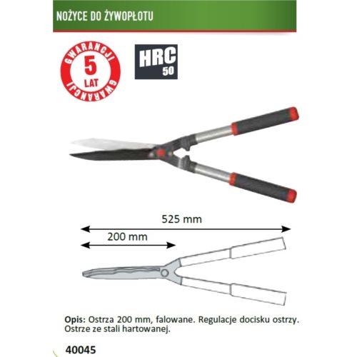 Ręczne nożyce do żywopłotu 5 lat gwarancji, Proline 40045Ostrza nożyc do żywopłotu: 200 mm, falowane.Długość całkowita nożyc 525 mm.Regulacja docisku ostrzy nożyc do żywopłotu.Ostrze ze stali hartowanej o wysokiej twardości i wytrzymałości