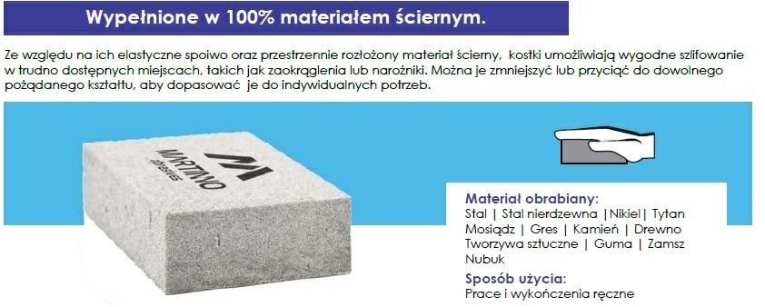 Ze względu na ich elastyczne spoiwo oraz przestrzennie rozłożony materiał ścierny, kostki umożliwiają wygodne szlifowaniew trudno dostępnych miejscach, takich jak zaokrąglenia lub narożniki. Można je zmniejszyć lub przyciąć do dowolnegopożądanego kształtu, aby dopasować je do indywidualnych potrzeb.Materiał obrabiany:Stal | Stal nierdzewna |Nikiel| TytanMosiądz | Gres | Kamień | DrewnoTworzywa sztuczne | Guma | ZamszNubukSposób użycia:Prace i wykończenia ręczne