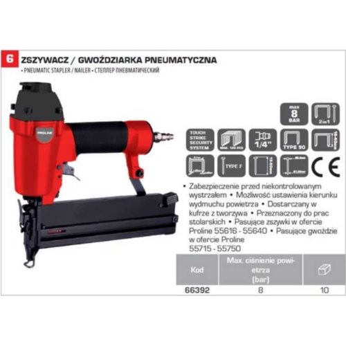 Urządzenie przeznaczone jest do wbijania szpilek o rozmiarach od 15 mm do 50 mm w powierzchnie drewniane twarde lub miękkieGwoździe łączone bezpośrednioRegulacja głębokości wbijanych gwoździ druciaków przy pomocy pokrętłaSpecjalny uchwyt może być obracany o 180° w lewo/prawoWzierniki magazynka umożliwiają ciągłą obserwację ilości posiadanych gwoździ druciaków, co pozwala napełniać go w odpowiednim momencie i uniknąć “suchych” strzałówObrotowa o 360° dysza wydmuchu powietrza i pyłu kieruje je z dala od użytkownika