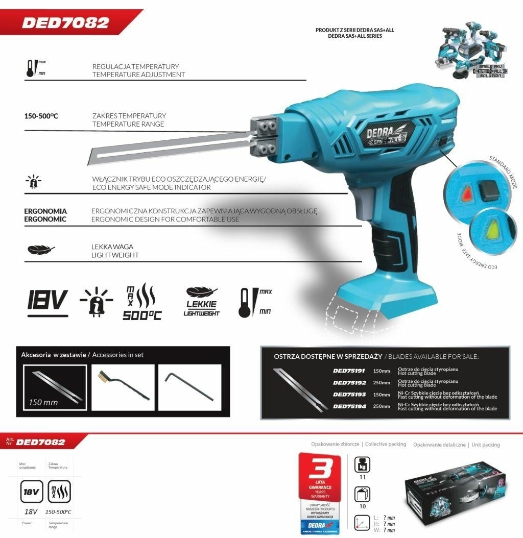 Nóż termiczny akumulatorowy DED7082 służy do przecinania elementów wykonanych z polimerów: PP-polipropylen, PCV-polichlorek winylu, EPS (styropian), np: płyty styropianowe, liny z tworzyw sztucznych.Przecinane krawędzie są idealnie równe, bez wyszczerbień i kłopotliwych okruchów w przypadku styropianu. Ostrze zostało tak wykonane, aby umożliwić wycinanie nawet bardzo skomplikowanych kształtów. Urządzenie może przecinać materiały do max. 150/250mm grubości. Czas rozgrzania ostrza do temperatury roboczej 500°C to tylko 6s. Nóż termiczny akumulatorowy DED7082 posiada możliwość regulacji temperatury.Rekomendowane ostrza zamienne DED75191, DED75192, DED75193, DED75194.Cechy akumulatorowego noża termicznego DED7082:Wymienne, elastyczne ostrzeSzybkie nagrzewanie ostrza – 500°C w 6sRegulacja temperatury