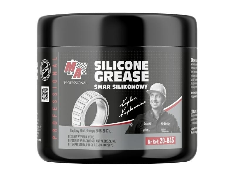 Wysokotemperaturowy, uniwersalny smar silikonowy przeznaczony do smarowania i zabezpieczania metalu, szkła, ceramiki i tworzyw sztucznych. Tworzy cienką, bezbarwną powłokę smarującą eliminującą tarcie i zabezpieczającą przed korozją. Preparat posiada znakomite właściwości konserwujące oraz pielęgnujące. Dzięki silnym właściwościom hydrofobowym chroni wnętrza zamków przed zamarzaniem. Środek posiada właściwości antystatyczne oraz zapobiega skrzypieniu. Idealnie nadaje się do smarowania współpracujących elementów wykonanych z różnych materiałów np. metalowych i plastikowych.