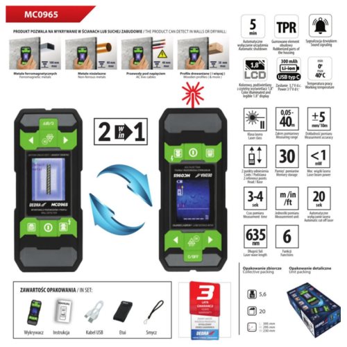 Wykrywacz przewodów i profili DEDRA MC0965 pozwala na wykrycie elementów i profili metalowych, przewodów elektrycznych bez i pod napięciem przemiennym oraz drewna, a także inne przedmioty takie jak żelazo, beton, szkło, aluminium itp.. Pomaga tym samym uzupełnić dokumentację techniczną budynków. Dodatkowo wykrywacz został wyposażony w funkcję dalmierza o zasięgu pracy 0,05-40m, co jest dużym udogodnieniem, gdyż zamiast dwóch urządzeń, mamy jedno.