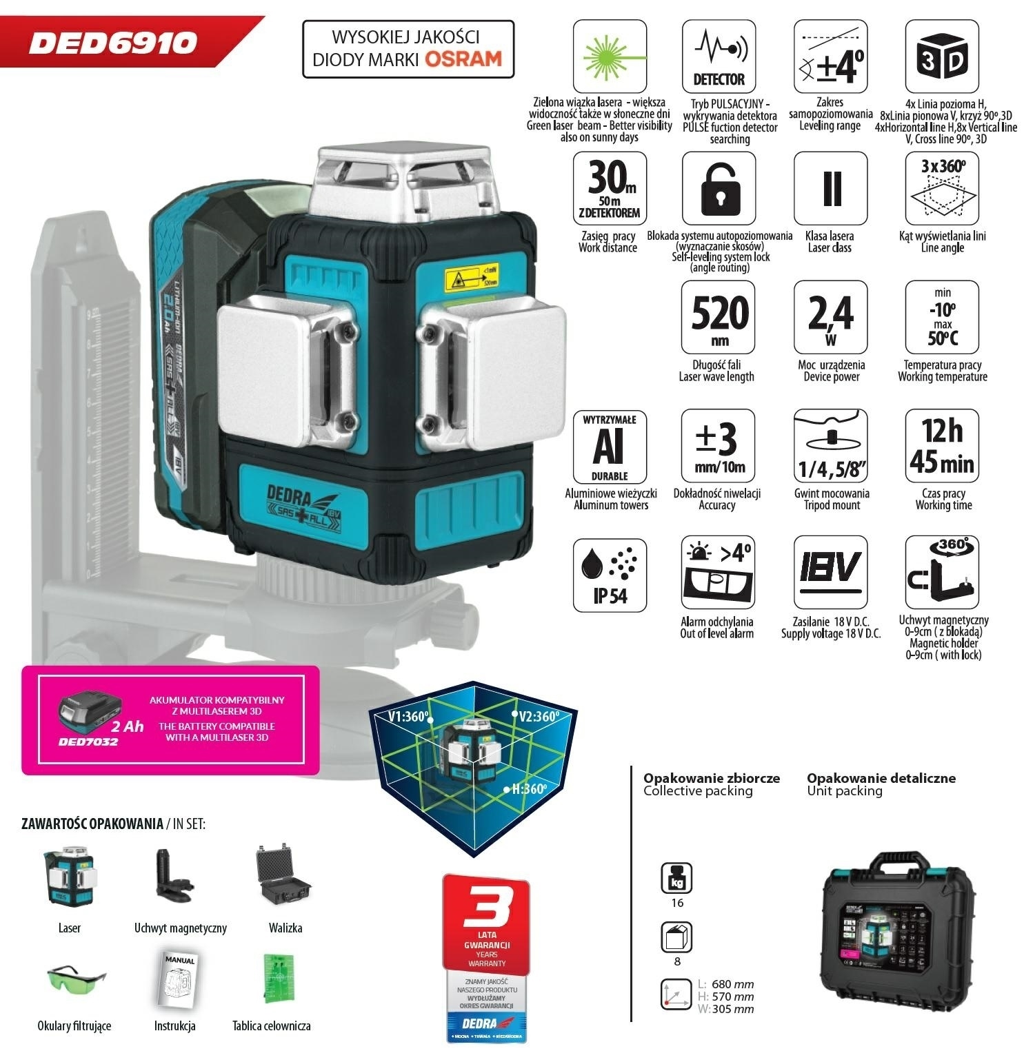 Laser pozwoli nam na automatyczne wytyczenie linii poziomych i pionowych. Laser wyświetla 4 linie poziome, 8 linii pionowych oraz linie krzyżowe. Zasięg lasera tego modelu wynosi 30m. Urządzenie przystosowane jest do pracy z detektorem, podczas której zasięg pracy zwiększa się do 50m. Laser posiada system samopoziomujący w zakresie 4°, co pozwala nam na pracę bez konieczności ręcznej kalibracji lasera.Laser jest przystosowany do pracy ze uchwytem magnetycznym bądź tyczką rozporową. Solidna obudowa chroni laser przed przypadkowym uszkodzeniem.