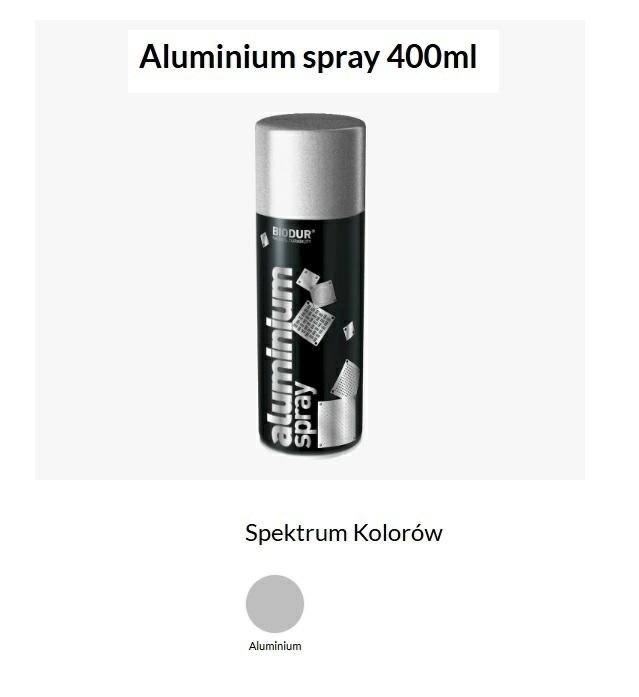Aluminium spray 400mlFarba aluminiowa do ochrony, renowacji, dekoracyjnego malowania metalu, drewna, szkła, cegły, betonu, plastiku i innych powierzchni. Chroni metal przed korozją. Zawiera drobno podzielone aluminium o wysokiej czystości (99,5%). Wytrzymuje temperatury od +300°C (stałe działanie) do +500°C (do 2 godzin).99,5% trwałe, czyste aluminiumOdporność na temperatury do 500°C (do 2 godzin)Doskonała przyczepnośćOchrona przed korozjąSzybkoschnącyNadaje się do różnych powierzchniOdporny na warunki atmosferyczneOdporny na promieniowanie UVDo użytku zewnętrznego i wewnętrznego