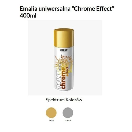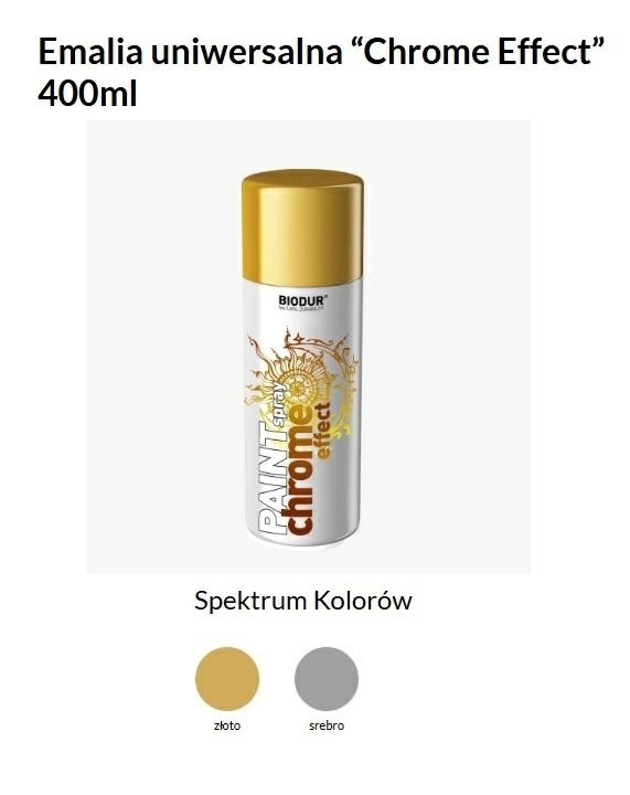 Emalia uniwersalna “Chrome Effect” 400mlSzybkoschnąca farba na bazie żywicy syntetycznej. Tworzy dekoracyjną powłokę z metalicznym połyskiem. Posiada doskonałe właściwości refleksyjne dzięki efektowi „lustra” chromowanego.Elegancki efekt metalicznego chromuIdealna do dekoracyjnych i kreatywnych prac malarskichDoskonałe pokrycieWysoki połyskSzybkoschnącaGładka powierzchniaNie pokrywać lakierem bezbarwnymNadaje się do różnych powierzchniTylko do użytku wewnętrznego