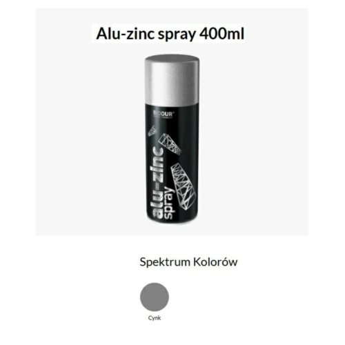 Alu-zinc spray 400mlFarba o wysokiej zawartości cynku i aluminium do antykorozyjnej obróbki powierzchni ocynkowanych, produktów ze stali, aluminium, metali żelaznych i nieżelaznych. Wytrzymuje temperatury od +250°C (stałe działanie) do +350°C (do 2 godzin). Zapewnia długotrwałą ochronę katodową przed rdzą. Tworzy silną powłokę ochronną w miejscach mocowania, spawania, wiercenia, cięcia.Ochrona przed korozjąOdporność na temperatury do 350°C (do 2 godzin)Do naprawy uszkodzonych powierzchni cynkowychDo stosowania przy spawaniu punktowymDo metalu i aluminiumSzybkoschnącyDoskonała przyczepnośćOdporny na warunki atmosferyczneOdporny na promieniowanie UVDo użytku zewnętrznego i wewnętrznego