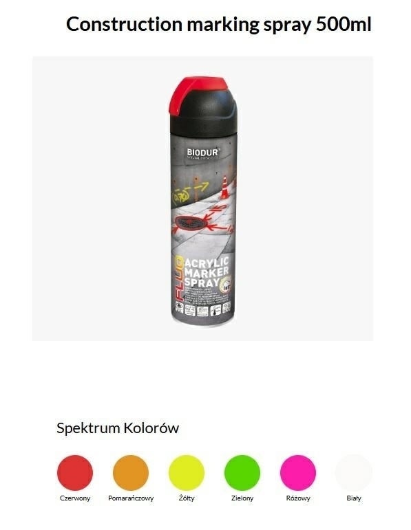 Construction marking spray 500mlSpecjalna farba fluorescencyjna o wysokiej jasności do profesjonalnego oznakowania na placach budowy obiektów mieszkalnych i przemysłowych.Farba może być używana pod każdym kątemZakres temperatur stosowania: -10°C do 45°CWysoka widoczność nawet z daleka dzięki swojej wysoce fluorescencyjnej formuleOdporna na warunki atmosferyczneErgonomiczna pokrywa umożliwia używanie rękawicFarba zawiera jasny pigment fluorescencyjny i pozostaje widoczna przez 6-12 miesięcy w zależności od powierzchni, warunków aplikacji i ekspozycji na UVPozwala narysować wyraźną linię o całkowitej długości 300 metrówSzybkoschnąca: około 7-10 minutOdporna na promieniowanie UVDoskonała przyczepność do wielu powierzchniMożliwość 100% opróżnienia puszki przez rozpylanie