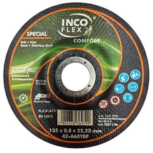 Nasza pierwsza tarcza o grubości poniżej 1mm, dedykowana do szlifierek akumulatorowych. Zapewnia najwyższą szybkość cięcia oraz znacząco zwiększa ilość cięć możliwych do wykonania z wykorzystaniem pojedynczego akumulatora.Oferuje najwyższą szybkość cięcia przy użyciu szlifierek zasilanych sieciowo, w najmniejszym stopniu nagrzewa obrabiany materiał oraz zapewnia redukcję zużycia energii w porównaniu do tarcz 125x1,0.Występuje TYLKO w wersji: 42 – z obniżonym środkiem do przecinania.Dane techniczne:Wymiar: 125x0,8x22,23Typ tarczy: 42 - z obniżonym środkiem do przecinaniaZalecane zastosowanie: stal zwykła, stal nierdzewnaOpcjonalne zastosowanie: stal wysokostopowa, szybkotnąca, kwasoodporna, staliwoDopuszczalna prędkość: 12 250 1/minTwardość: T - bardzo twarda