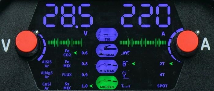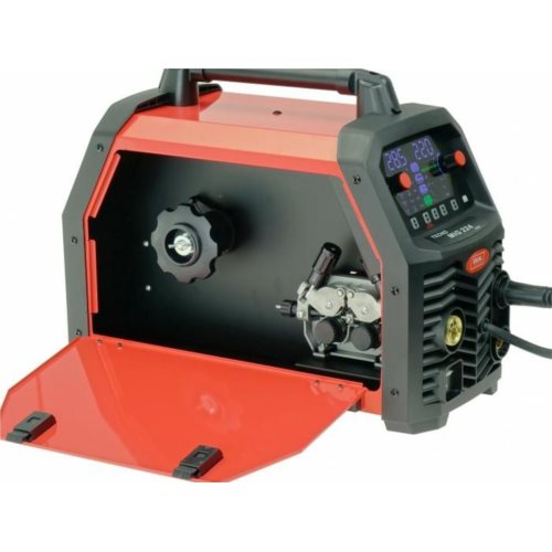 Inwertorowy profesjonalny półautomat spawalniczy do spawania metodą MIG-MAG, FLUX oraz spawania metodą MMA elektrodą otuloną. Prąd spawania 220A. Zasilanie 230V. Średnica drutu spawalniczego 0,6-1,0mm. Podajnik drutu 4-rolkowy